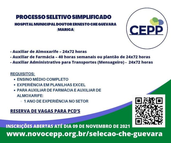 LINK PARA PUBLICAÇÃO NO INSTAGRAM As oportunidades são para: · Auxiliar de almoxarifado · Auxiliar de farmácia · Auxiliar administrativo para transportes As inscrições serão exclusivamente online, através do link www.novocepp.org.br/selecao-che-guevara, até dia 09 de novembro de 2021.